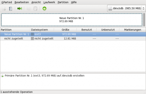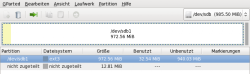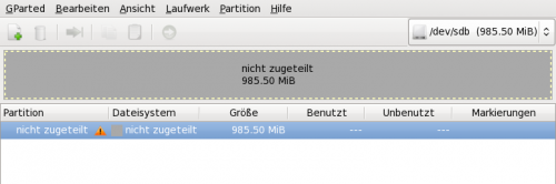 Wir wählen den zweiten Eintrag, es können wenn mehrere Festplatten im Verbund sind auch mehrere Einträge angezeigt werden. Da wir bei unserem Beispiel wissen das unser USB-Stick nur 1GB Speicherkapazität besitzt, sollte die Auswahl /dev/sdb (985.50MiB) passen.