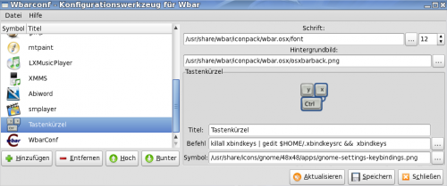 Zum einem wird xbindkeys gestoppt und gedit gestartet, welches gleichzeitig die Datei xbindkeysrc lädt. Da es sich um eine versteckte Datei handelt, wird diese mit einen Punkt versehen, also .xbindkeysrc. Damit aber gedit weiß, wo die Datei liegt, habe ich $HOME angegeben, man kann auch ~ nehmen. Das deutet darauf hin, das die Datei im unserem Homeverzeichnis liegt. Das && Zeichen bedeutet das der nächste Befehl warten soll, bis der eine abgearbeitet ist. Noch ein Symbol zugewiesen, das benötigt die Wbar um korrekt zu arbeiten und fertig. Nun klickt man auf speichern und aktualisieren, der Eintrag sollte nun in der Wbar vorhanden sein.